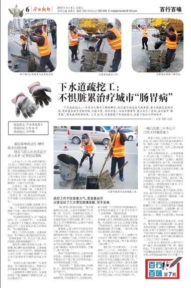 下水道疏挖工,一個(gè)很多人都不了解的群體,他們整日承受臭氣的熏蒸,整日挖掘惡臭的污泥,有時(shí)甚至徒手清除污物,又臟又累。他們?nèi)諒?fù)一日地辛勤勞作,愿以自己一身泥,治療城市“腸胃病”,換來(lái)城市的凈和美。2月28日,記者跟隨下水道疏挖工,體驗(yàn)了他們工作的艱辛。