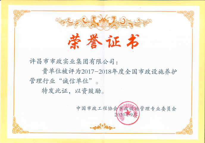 此外,許昌市政集團(tuán)還被評為2017-2018年度“全國市政設(shè)施養(yǎng)護(hù)管理行業(yè)誠信單位”。